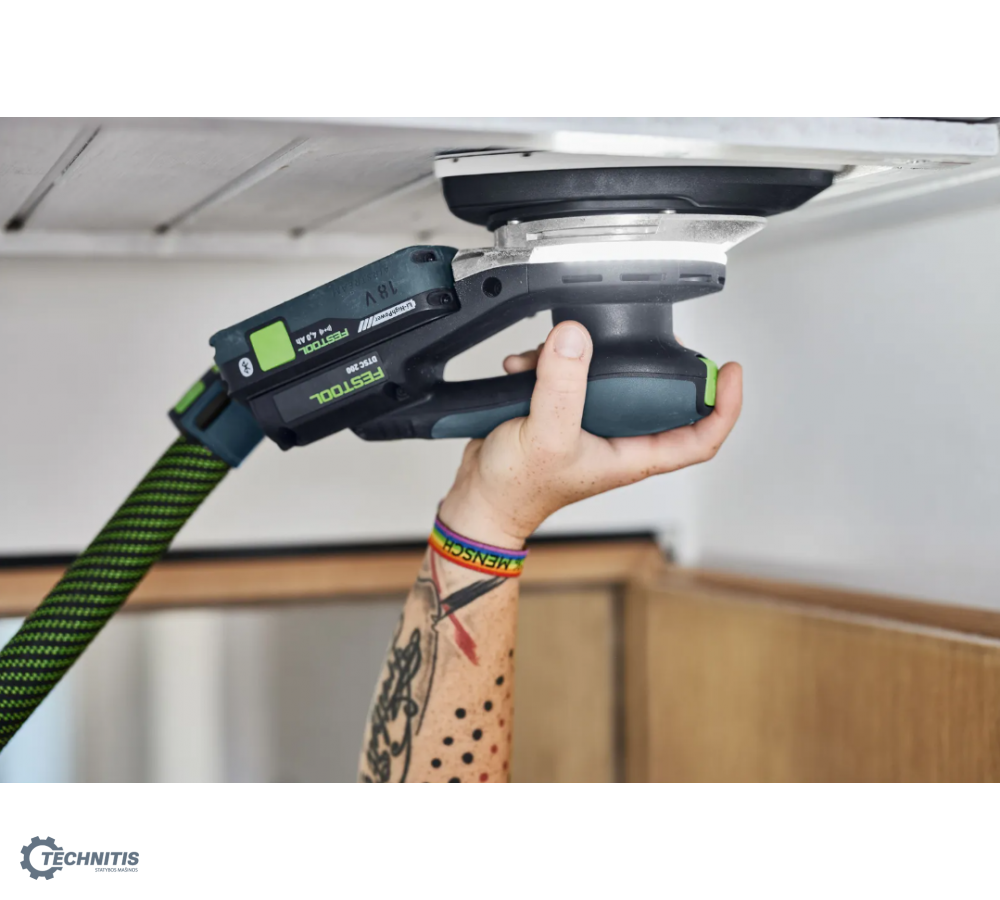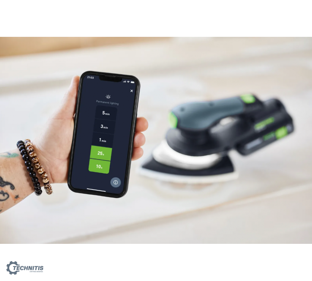 - Daugiau galimybių su „Festool“ programėle: išmaniuoju telefonu galima individualiai ir patogiai reguliuoti apšvietimą bei nustatyti jo trukmę – tai leis dar kartą patikrinti paviršių po šlifavimo