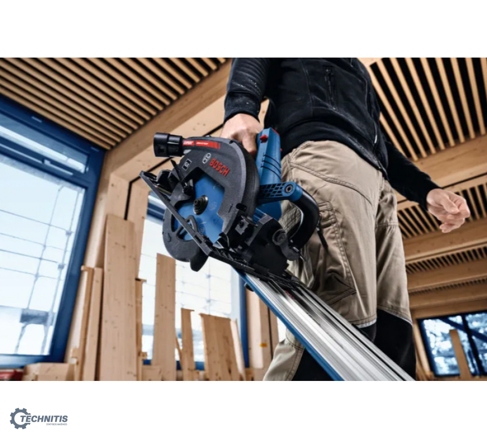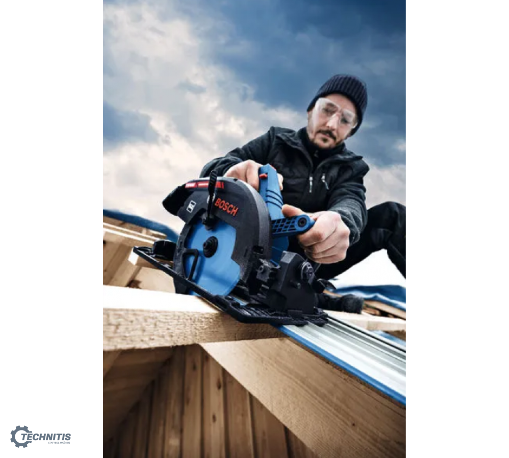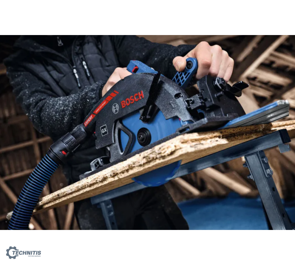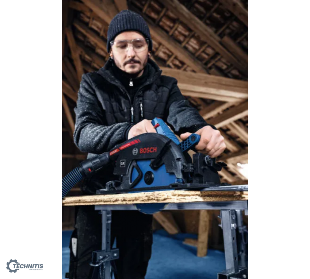 - Skirtas skersiniam pjovimui: suderinamas su „Bosch FSN X“ kreipiančiosiomis liniuotėmis, įrankis paverčiamas mobiliuoju skersinio pjovimo pjūklu